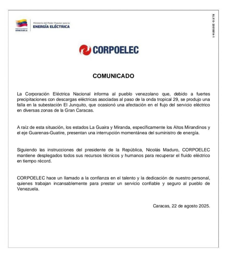 El ministro de Comunicación, Freddy Ñáñez, explicó a través de su canal en Telegram que las lluvias intensas y los fuertes vientos ocasionaron una avería en la subestación de El Junquito, lo que afectó parcialmente al centro del país, incluyendo La Guaira, Guarenas, Guatire y parte del este de Caracas.